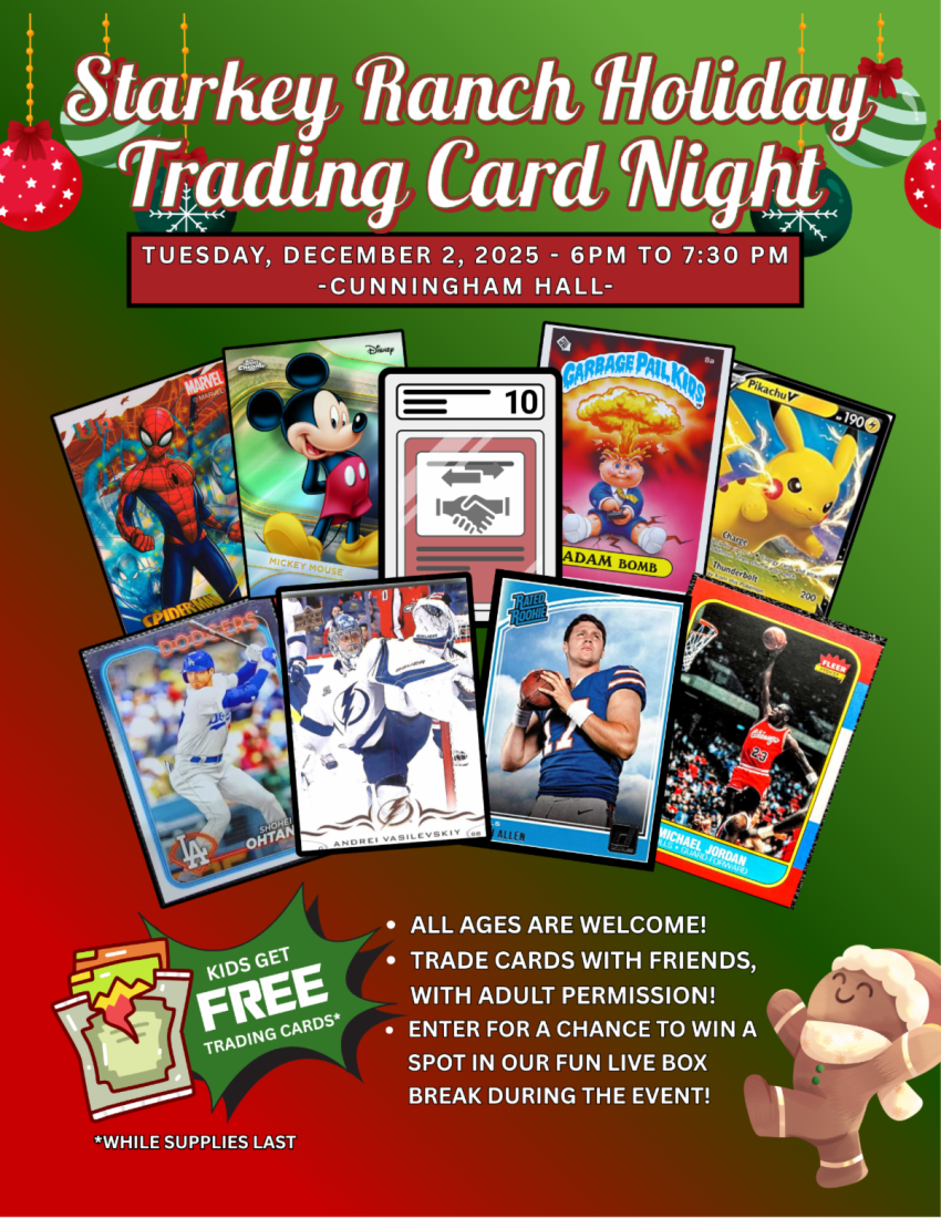 🎄 Starkey Ranch Holiday Trading Card Night 🎄 Get ready for an exciting evening of trading, collecting, and holiday fun! Tuesday, December 2, 20256:00 PM – 7:30 PMCunningham Hall Join us for a festive night where collectors of all ages can come together to trade cards with friends and fellow enthusiasts! Whether you’re into sports…