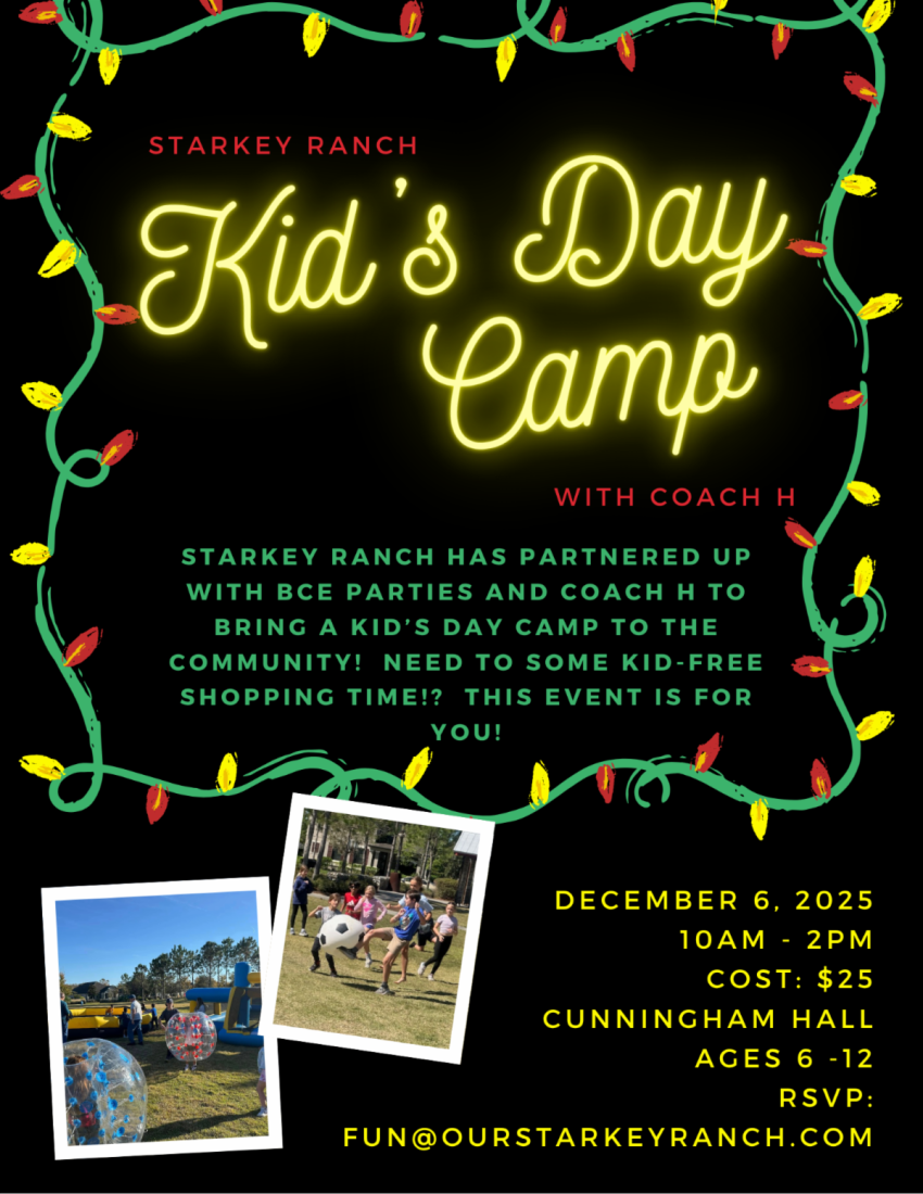 🎄 STARKEY RANCH KID’S DAY CAMP IS HERE! 🎄 Get ready for the ULTIMATE holiday break adventure! Starkey Ranch has partnered up with BCE Parties and Coach H to bring an EPIC Kid’s Day Camp to the community! Need some kid-free shopping time this December? THIS EVENT IS FOR YOU! 🎮 GET READY FOR NON-STOP…